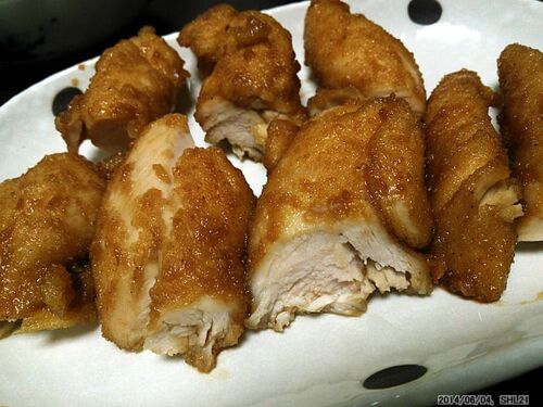 何の気なしに思いついたメニュー。恒例のごとく、鶏のササミは下ごしらえとして筋を取った上、すり下ろした玉ねぎ+塩にしばらく漬け込んで、軟らかくすると同時に下味もつけておく。漬け込んだ後は一旦表面を洗い、唐揚げ粉をつけて揚げてしまう。そして、…