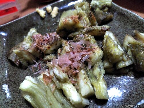 昨日の流れから、当然の帰結だが、このような結果となった。新鮮だと、やはり茄子は甘い。焼くと、香りも良く、次々に胃袋に吸い込まれます。焼いた直後でないと、皮を上手く剥くことが出来ないわけですが、若かりし頃はこれが苦手だった。氷水で指を冷やす…