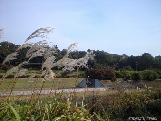 ススキのある風景も・・・。風にたなびくススキも味わいがありますね。
