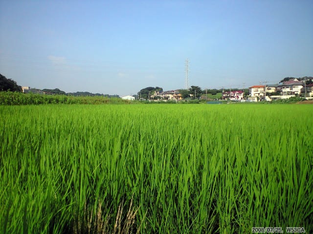 更に深くまで進むと、住宅地を通り抜けて畑や田んぼが現れてきます。ギラギラと日差しは容赦なく照りつけます。強い夏日を受けて、稲も隆々と伸びている様・・・。