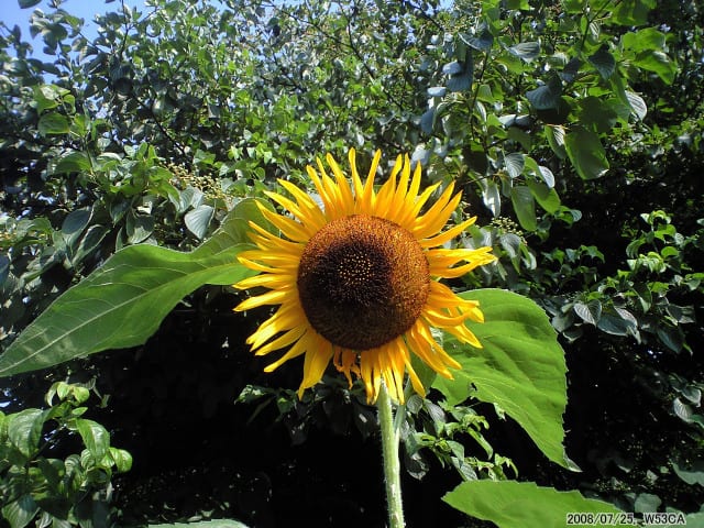 監禁先での脱獄徘徊は、エアコンから逃れる術がない生活の中で、唯一自然を感じる事が出来る時間です。今朝も8kmあまり、流山市の自然が多いコースをウロウロと散策してみました。開口一番に見つけた被写体、夏の風物詩ひまわり。住宅地にぽつんと離れ小島の様にある雑木林の入り口で見つけました。