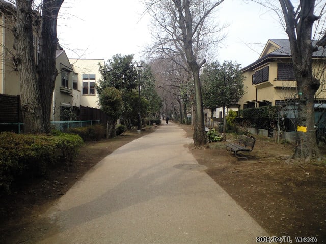結局ここからレポートとなってしまいますが(笑)、しばしお付き合いください。脇道に踏み込んだ目的はこの遊歩道。この遊歩道は境浄水場へと延びていた東京都水道局専用線の跡地なのです。以前、隣の三鷹駅を起点とした武蔵野競技場線跡(記事)についてレポートした事がありましたが、実は今回踏み込んだ廃線跡とは密接な関係があります。