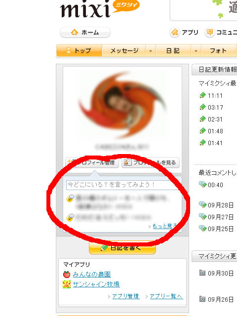 最近、mixiの「マイミクのボイス」なるコーナーが目に付くところに配置されました。これは、「今何しているの?」の問いかけに対して、今のつぶやきを書き込んでゆくというもの。いわゆるマイミクの方々のつぶやきが、次々に更新されて目に飛び込んでくるというものです。