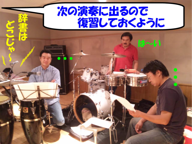 昨日はリハーサル。次回ライブに向けて綿密な打ち合わせを行いました。先のガッシュ君でも、あまり演奏していないように見えると言われていましたが、本当に音を出す時間は短いです(笑)。