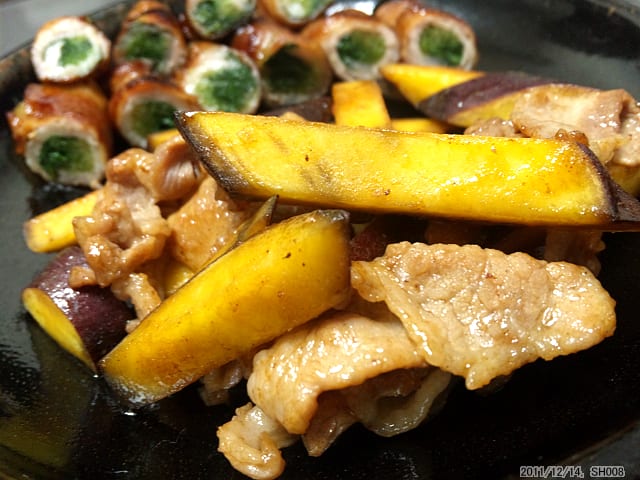 長いこと鎮座ましますサツマイモもバラ肉攻撃。ところが、サツマイモはバラ肉の脂攻撃も柔らかく吸収して知らん顔。ちょこざいなヤツめ、と思ったがその脂で旨くなりやがった。あっぱれとほめてつかわす。