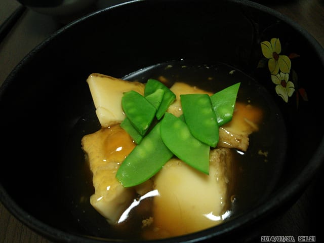 と、ここで夏場にお勧めの冷製メニュー。材料は上記の夕食メニュー『厚揚げのあんかけ』を参照してください。筆者はこちらのもっちりやわらか厚揚げを愛用しています。出汁は一番出汁でも二番だしでもおいしく上がります。一番出汁を使う場合、酢はいらないでしょう。手順としては、厚揚げを空茹でして油を抜くことくらいです。あとは、出汁で炊きあげ、味付けしてとろみをつけ、あとは冷やすだけ。暑さで食欲も減退しがちですが、身体にも優しくいただくことができます。
