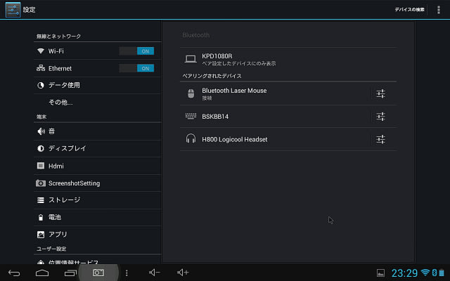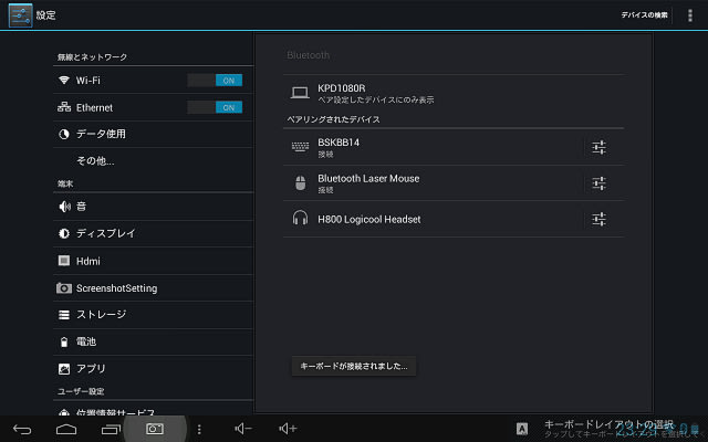 ウィジェットの左の設定ボタンを押すと、こともあろうにBluetoothのペアリング画面が出てきてしまいます(笑)。なんじゃ?このユルさは・・・。なので、せっかくだから、Bluetoothマウスを接続してみます。