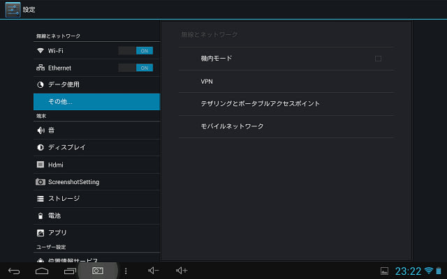 Androidタブレットの設定画面です。当然のことながら、Bluetoothの設定項目自体が見あたりません。普通はここであきらめるところなのですが、どうやら可能性が残っているということで、、、
