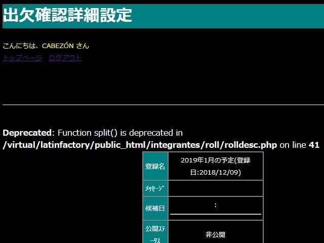 某 PHP といえばメンバーページ。従来は PHP に限ってローカルアドレスでアクセスする必要があったので、あちこちに書き換えなければならない部分があり、修正が大変でした。ようやく修正が終わったので、バンド業務を開始しようと予定表を作り始めたら、PHP のバージョン相違による動作不良。写真のように操作画面にエラーメッセージが表示されて鬱陶しいったらありゃしない。