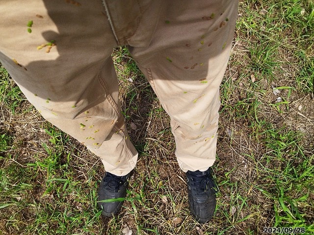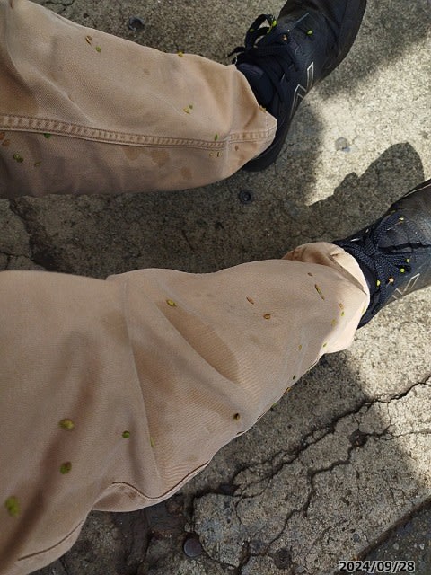 その片づけの最中に、うかつにも倉庫脇の茂みに割入ってしまいまして、、、気が付いたら種だらけになっていまして。しかも、これ、洗濯では落ちないらしい。